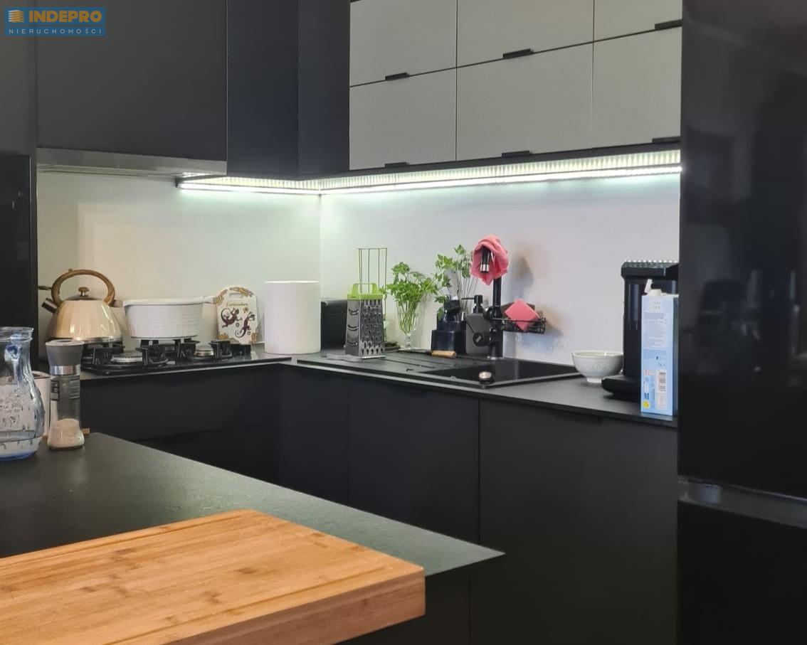 Ciemna, nowoczesna kuchnia z podświetleniem LED nadaje wnętrzu elegancji i charakteru. Salon z wyjściem na loggię tworzy komfortową przestrzeń dzienną, a duże okna zapewniają przyjemne światło.