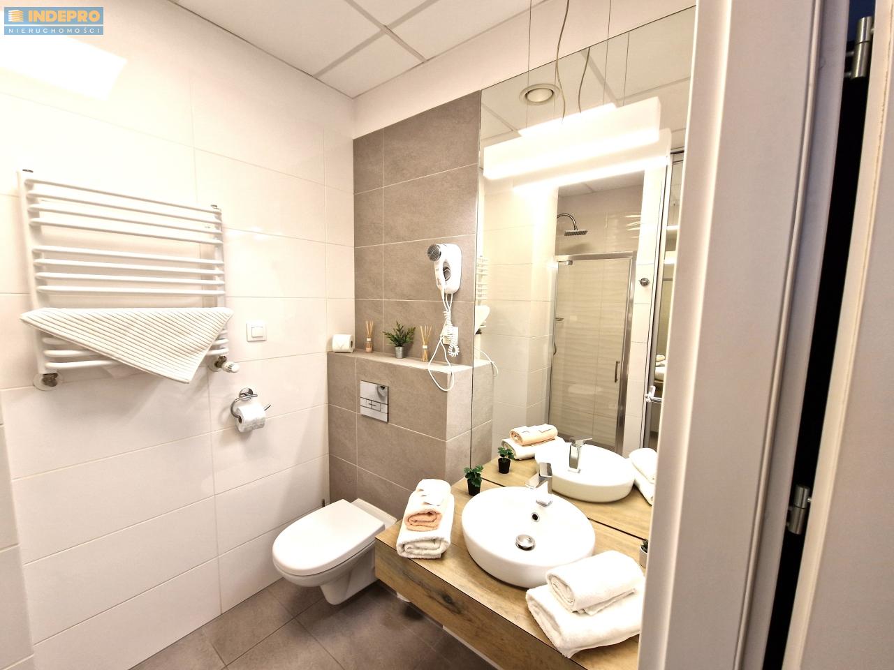Łazienka: Prysznic lub wanna, umywalka, WC, grzejnik, suszarka do włosów, komplet ręczników.