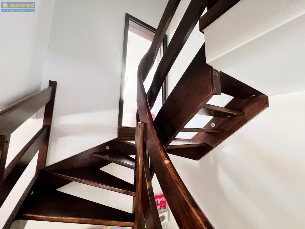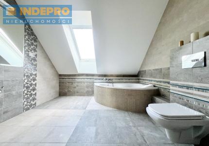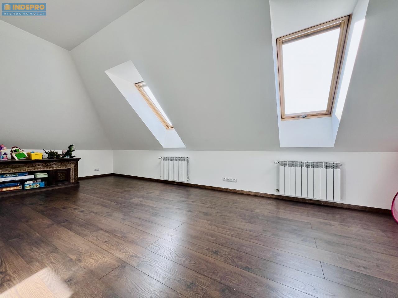 druga łazienka pralnia jedna z sypialni zlokalizowana na efektownym półpiętrze – ze skosami i oknami połaciowymi, co daje wyjątkowy klimat i świetne doświetlenie