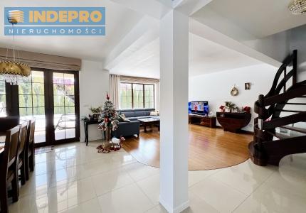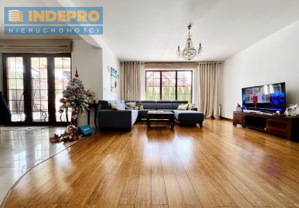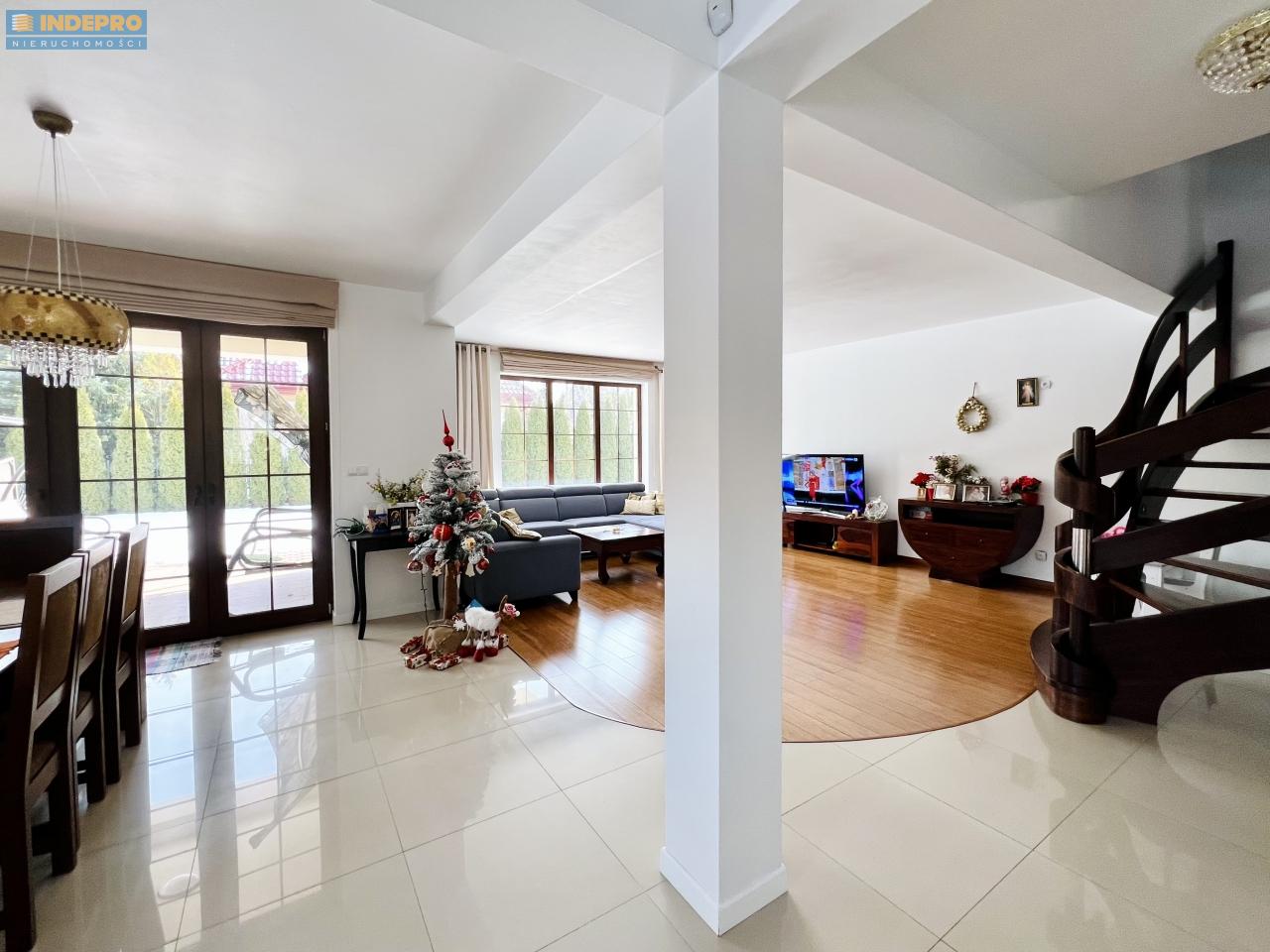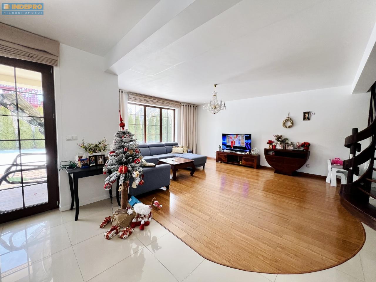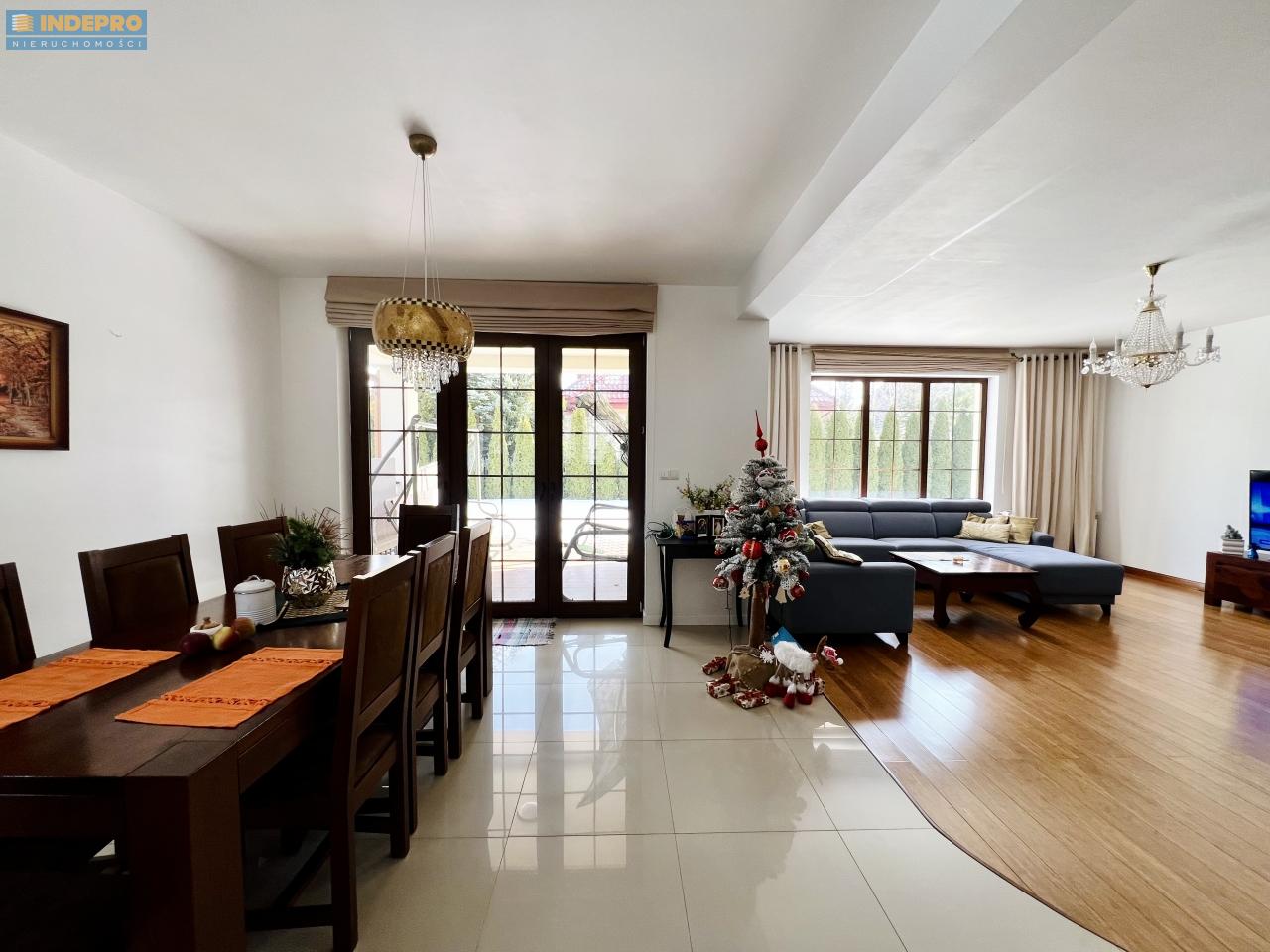 Strefa dzienna jest jasna, reprezentacyjna i naturalnie doświetlona. Duże przeszklenia, elegancka podłoga z drewnianej deski, spójna kolorystyka i bardzo dobre proporcje pomieszczeń.