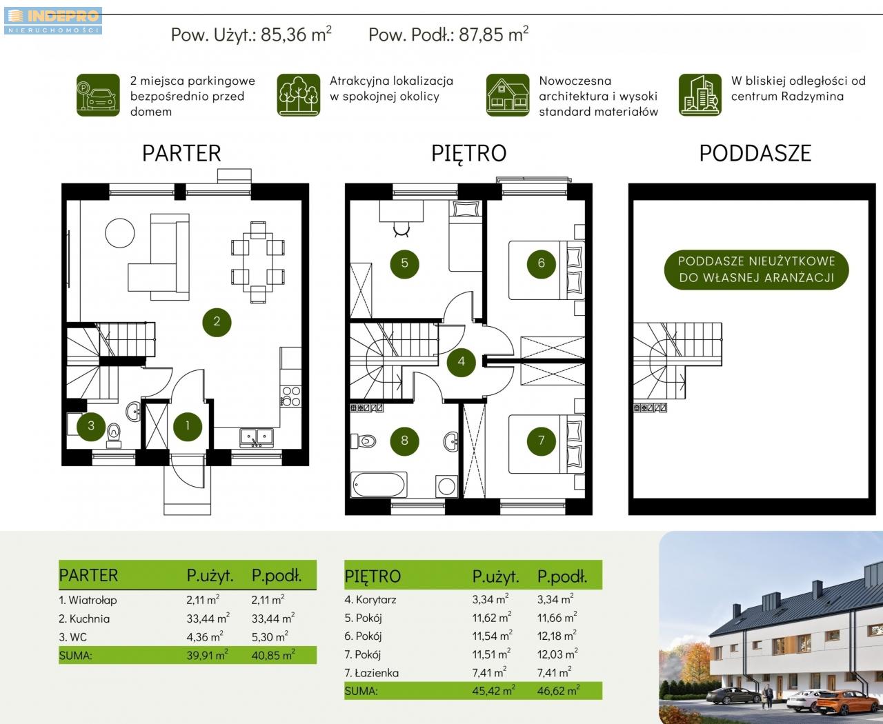 Dostępne segmenty o powierzchni użytkowej 85,36m² + poddasze, posiadają 4 pokoje.