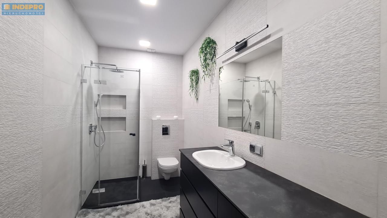 - łazienka wykończona w modnych, stonowanych barwach,