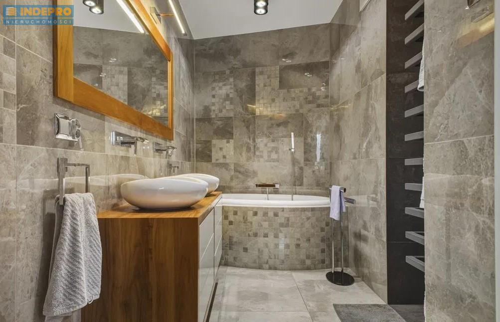 Naturalne drewno, elegancka zabudowa stolarska na wymiar, spójna kolorystyka, kamienne i drewniane akcenty w łazience oraz nowoczesna, w pełni wyposażona kuchnia z wyspą – całość tworzy harmonijną i bardzo dopracowaną przestrzeń.