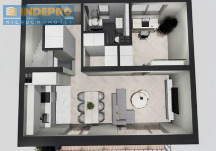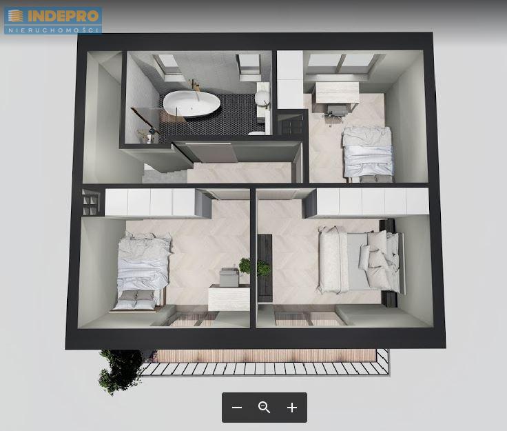 Mieszkanie jest na pierwszym i drugim piętrze, bez skosów. Każde piętro ma balkon 7 m2. Na pierwszym poziomie salon z aneksem kuchennym, gabinet, łazienka, garderoba. Na drugim piętrze 3 sypialnie i łazienka. Ogrzewanie i ciepła woda z pieca gazowego dwu-funkcyjnego, podłogówka. Na parterze będą mieszkali sąsiedzi w mieszkaniu 43 m2 z ogródkiem i osobnym wejściem.