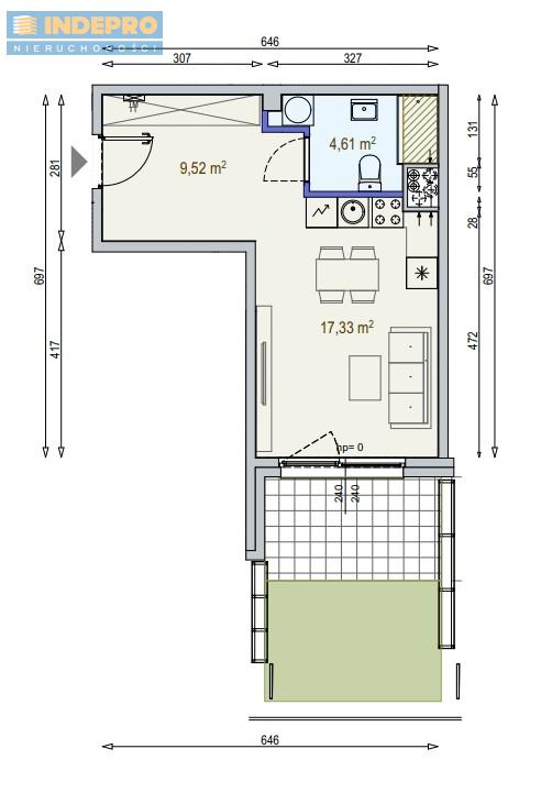 Prezentowane mieszkanie o powierzchni 31,46 m² znajduje się na parterze. Składa się z ustawnego pokoju dziennego z aneksem kuchennym, łazienki oraz części wypoczynkowej. Dzięki wysokości pomieszczeń 2,7 m lokal jest jasny i przestronny. To propozycja idealna zarówno dla singla, pary, jak i inwestora szukającego mieszkania pod wynajem.
